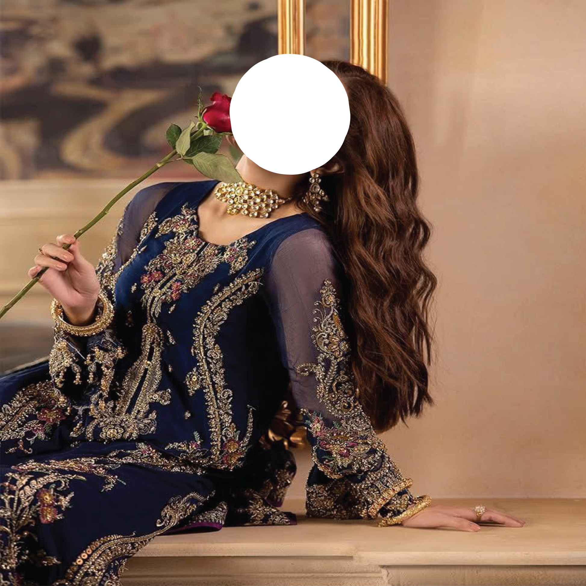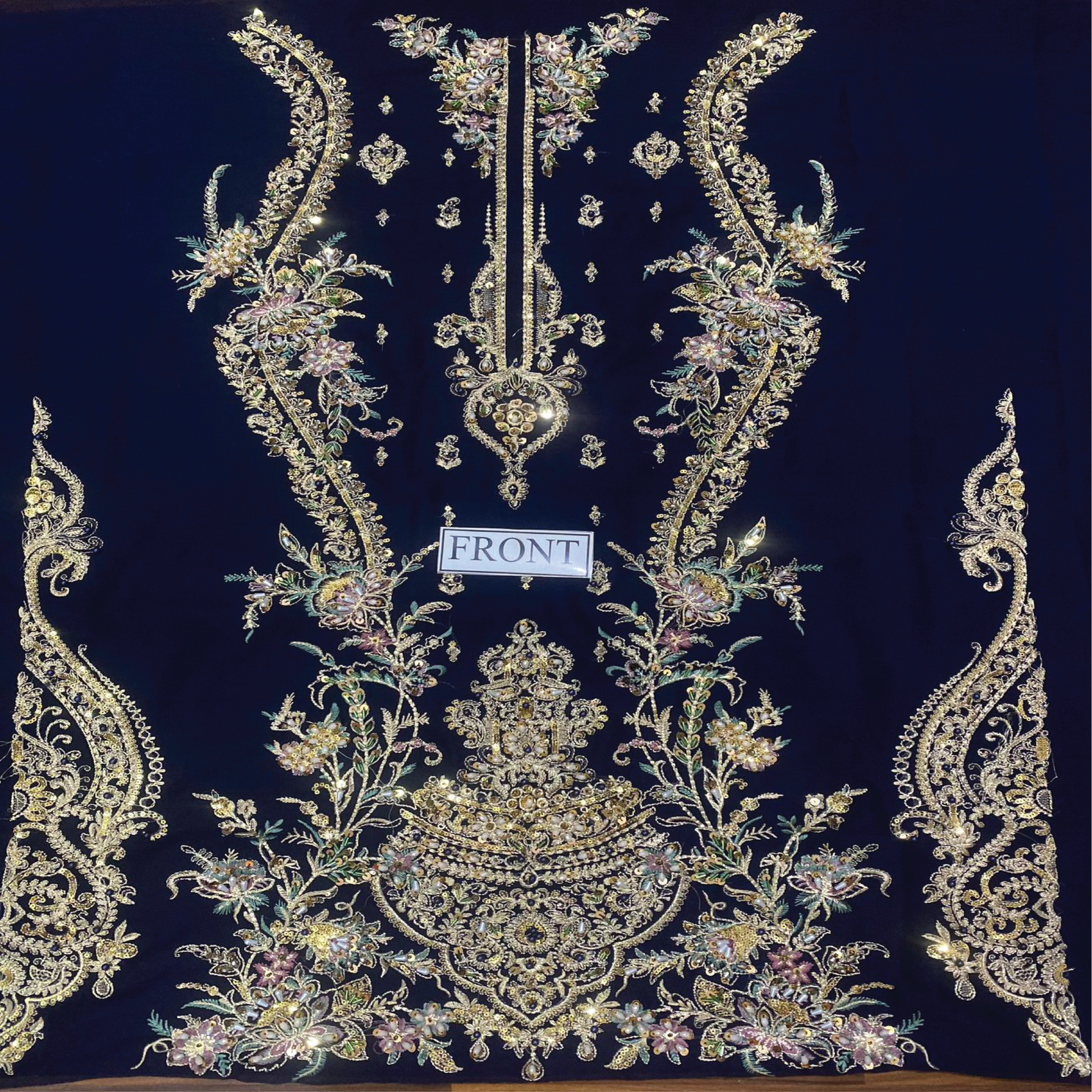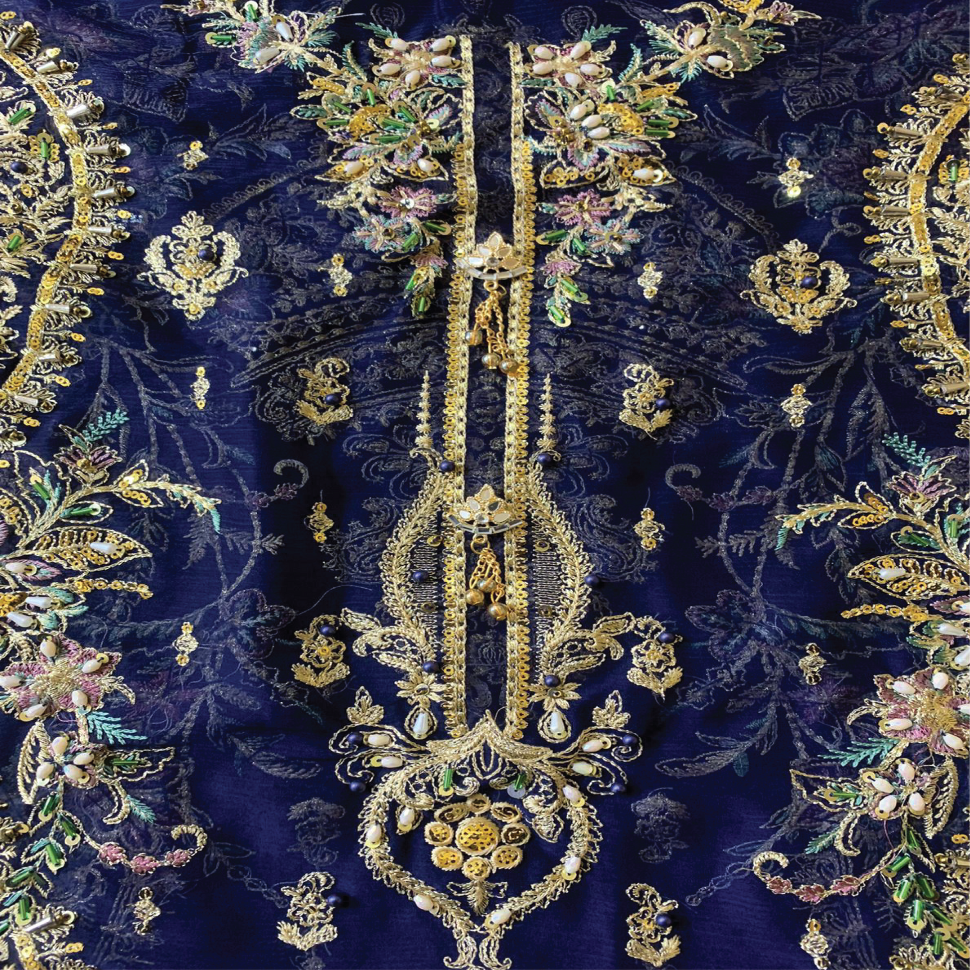 Paired with a flowing net dupatta and a plain malai crepe trouser, the outfit is designed to exude elegance and sophistication—ideal for weddings, receptions, and high-end festive occasions.