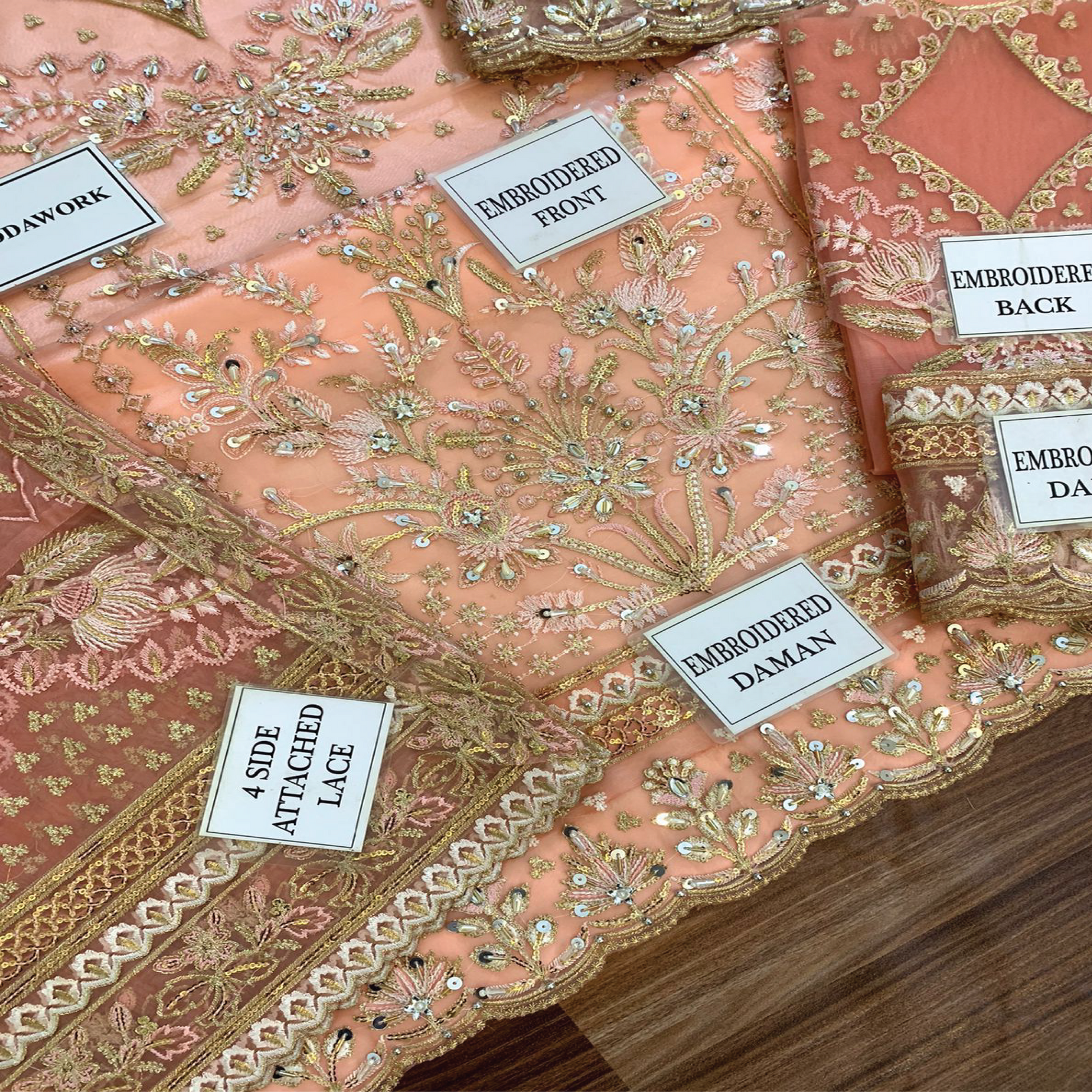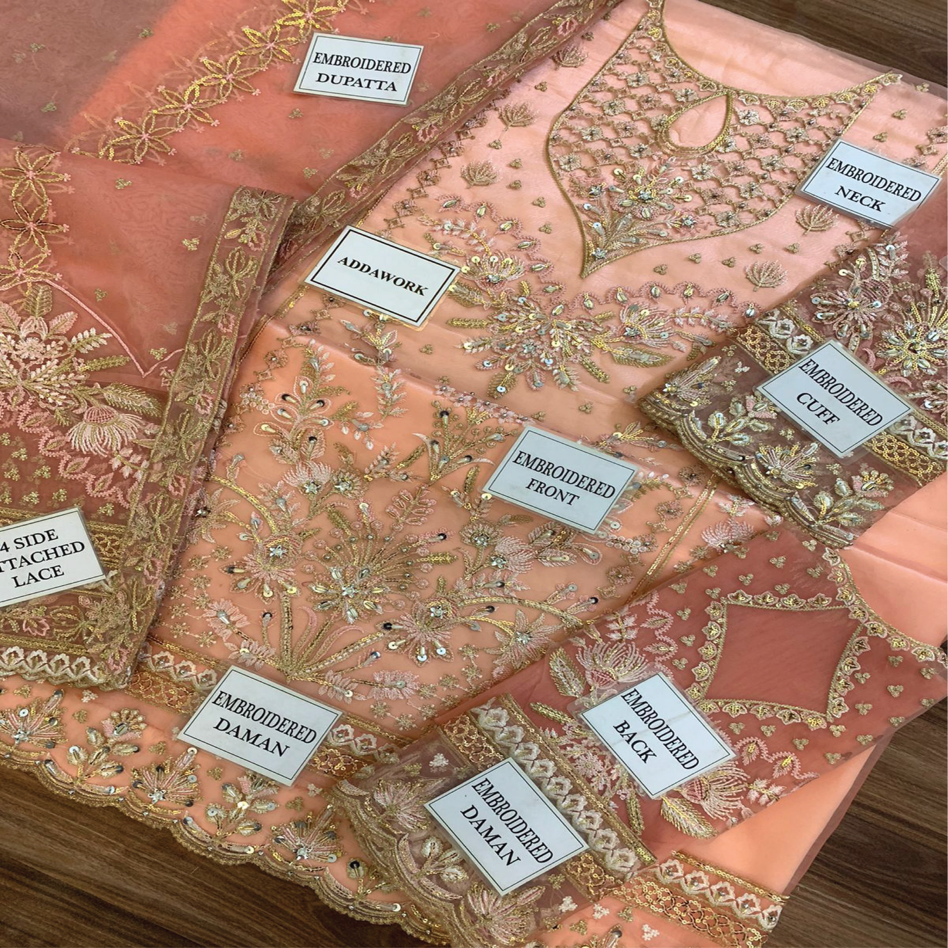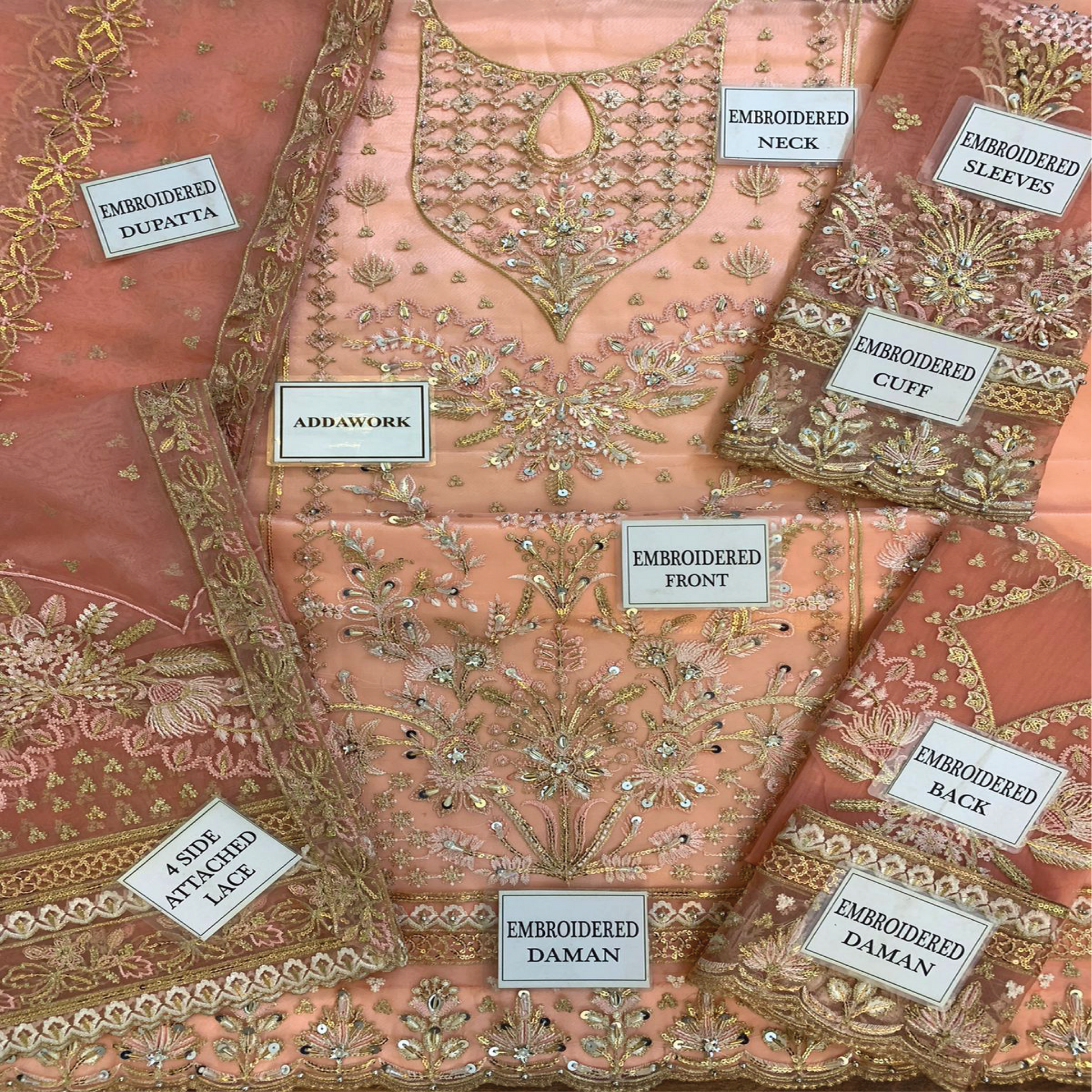 Fully embroidered organza front with alternate heavy embroidery and Adda work