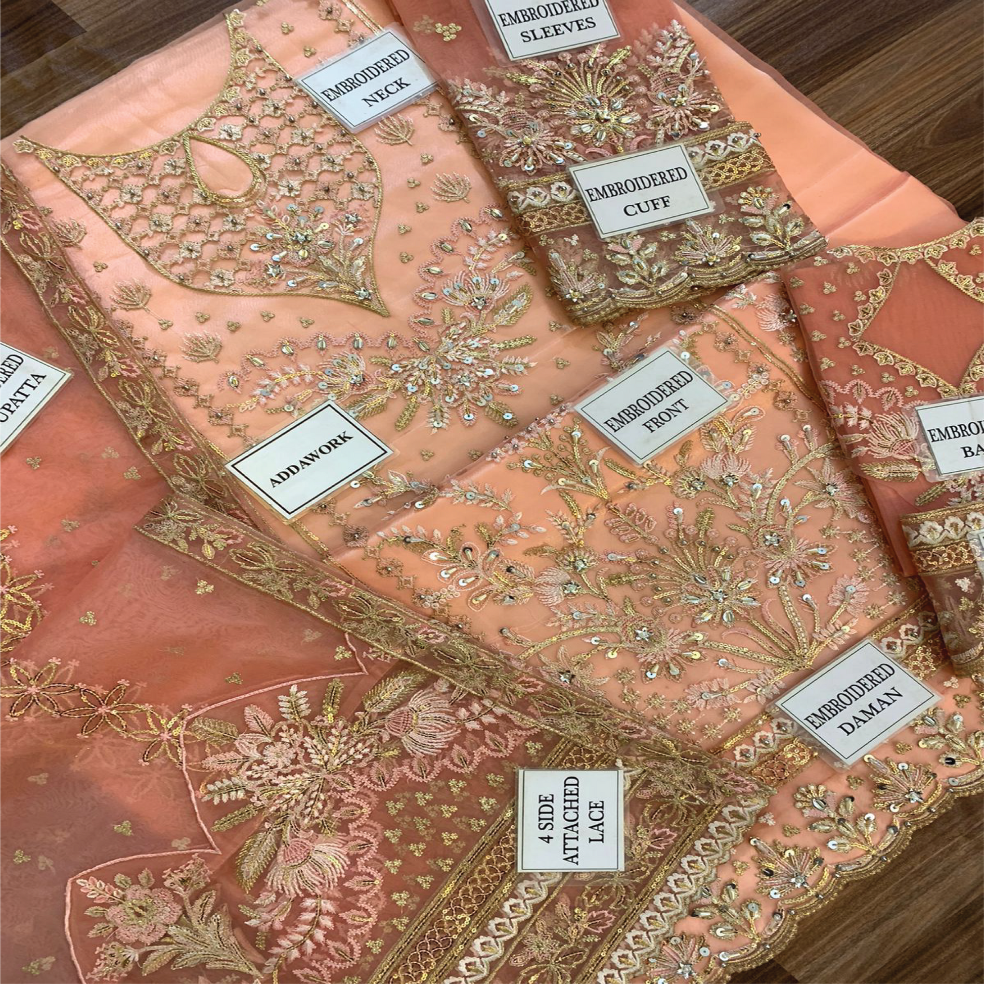 Paired with a dyed soft silk trouser, this ensemble balances rich texture with comfort. The organza dupatta completes the look with full heavy embroidery and lavish four-side embroidered borders, perfect for bridal wear and grand formal occasions.